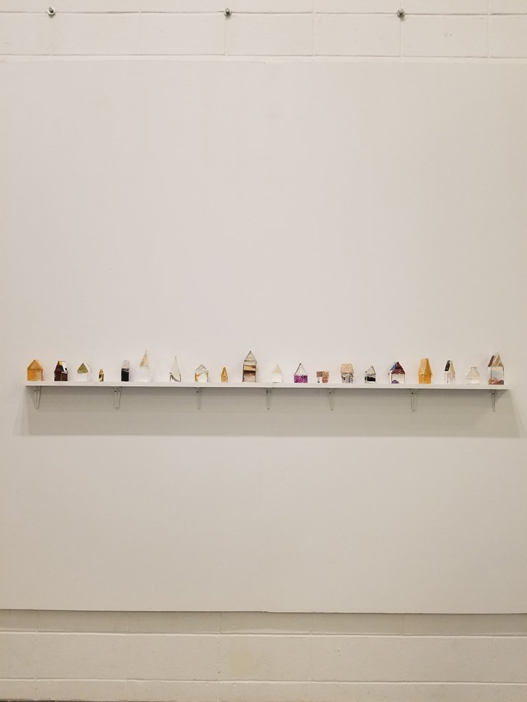 Domestic Postpartum is a project birthed during the delirium of a postpartum period. This work is an exploration emphasising the visual themes of motherhood, isolation, compulsion and absolute fatigue. Made from an act of destroying previously made two-dimensional work, torn and ripped fragments were then reconstructed and repurposed as over 2000 small house-like domestic objects. In the beginning these small sculptures were a response to the struggle of entering motherhood, isolation and obsessive compulsions. This project has evolved with a multidisciplinary approach using printmaking, drawing and painting while also examining themes of housing, mental health and parenting during a pandemic.
